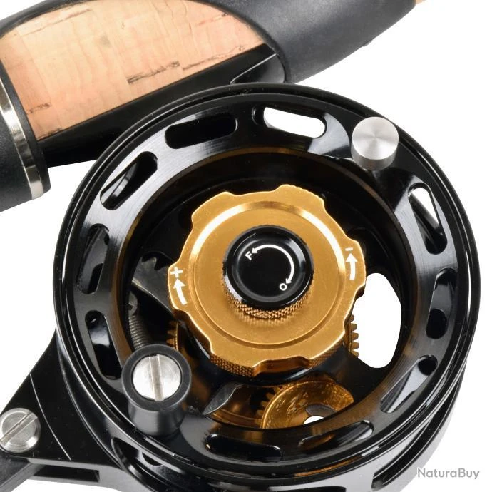 Cette vis centrale est la pièce la plus importante du moulinet, elle est celle qui maintient la bobine sur l’axe principal et permet aussi l’accès à la pignonerie et au système « sonnette de vélo » de récupération rapide. La particularité de cette vis centrale est d’avoir un pas à gauche (se visse dans le sens antihoraire), elle était par le passé fendue et pas toujours facile à desserrer, maintenant elle peut et doit se démonter avec les doigts et le sens de démontage (O pour ouvrir) ou de remontage (F pour Fermer) est gravé dessus de manière visible.