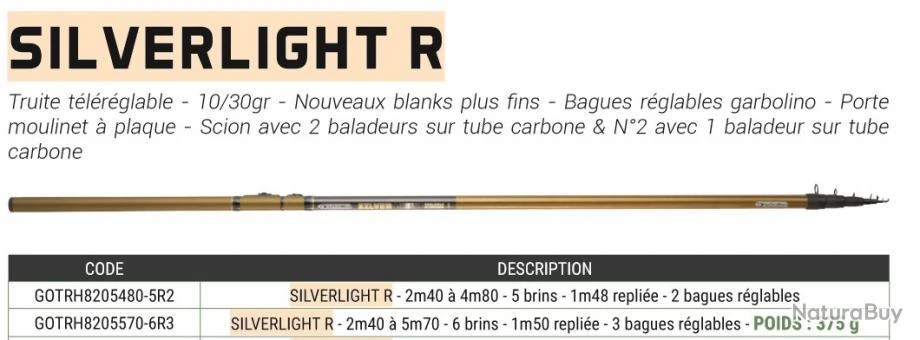 Caracteristiques Silverlight R 2m40 à 5m70 Max 30 G Canne Truite Téleréglable Garbolino :